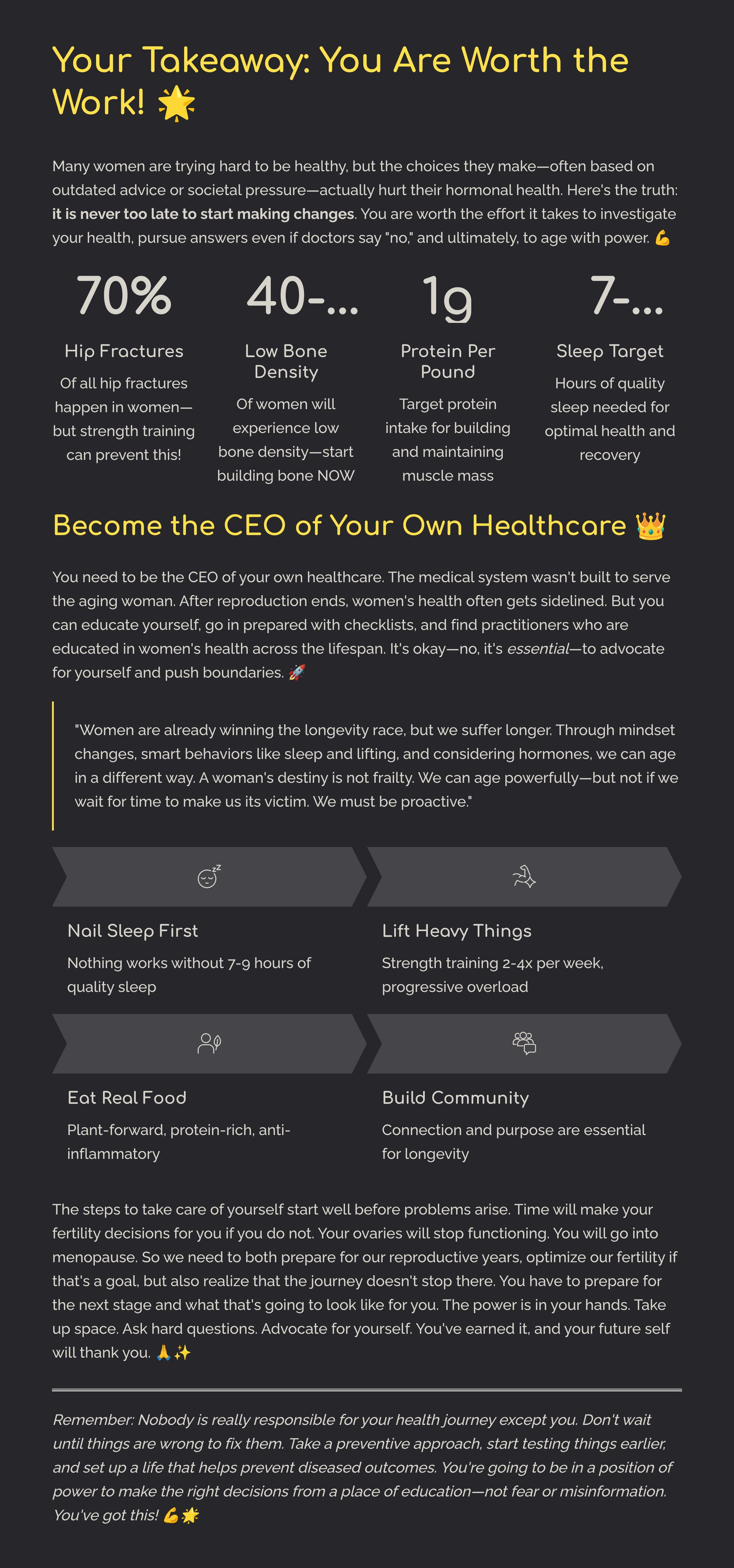 But guess what? Leading experts are finally spilling the secrets! They say that women are already winning the longevity race, but we need to stop being victims of time and start being proactive so we can age with power. It’s time to understand your unique body and become the CEO of your own healthcare journey.